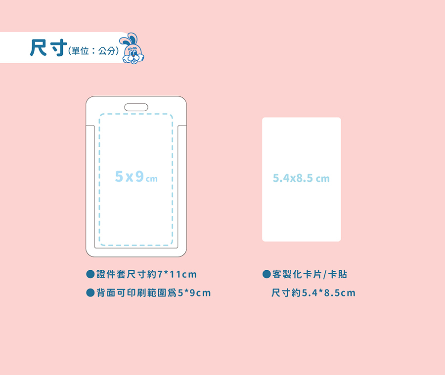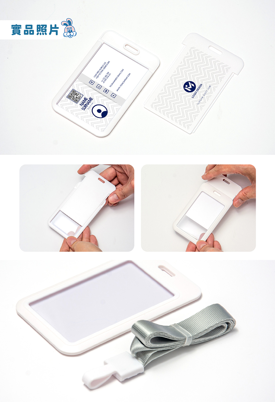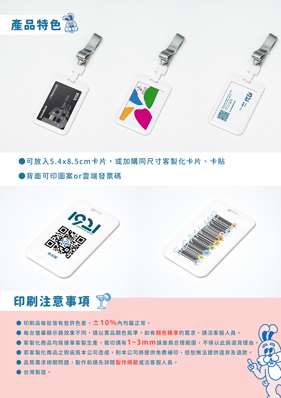 可放入5.4x8.5cm標準的悠遊卡或信用卡尺寸,加上同規格的一張名片,背面您可以印上您喜愛的圖案及雲端發票碼,讓您的識別證與眾不同!